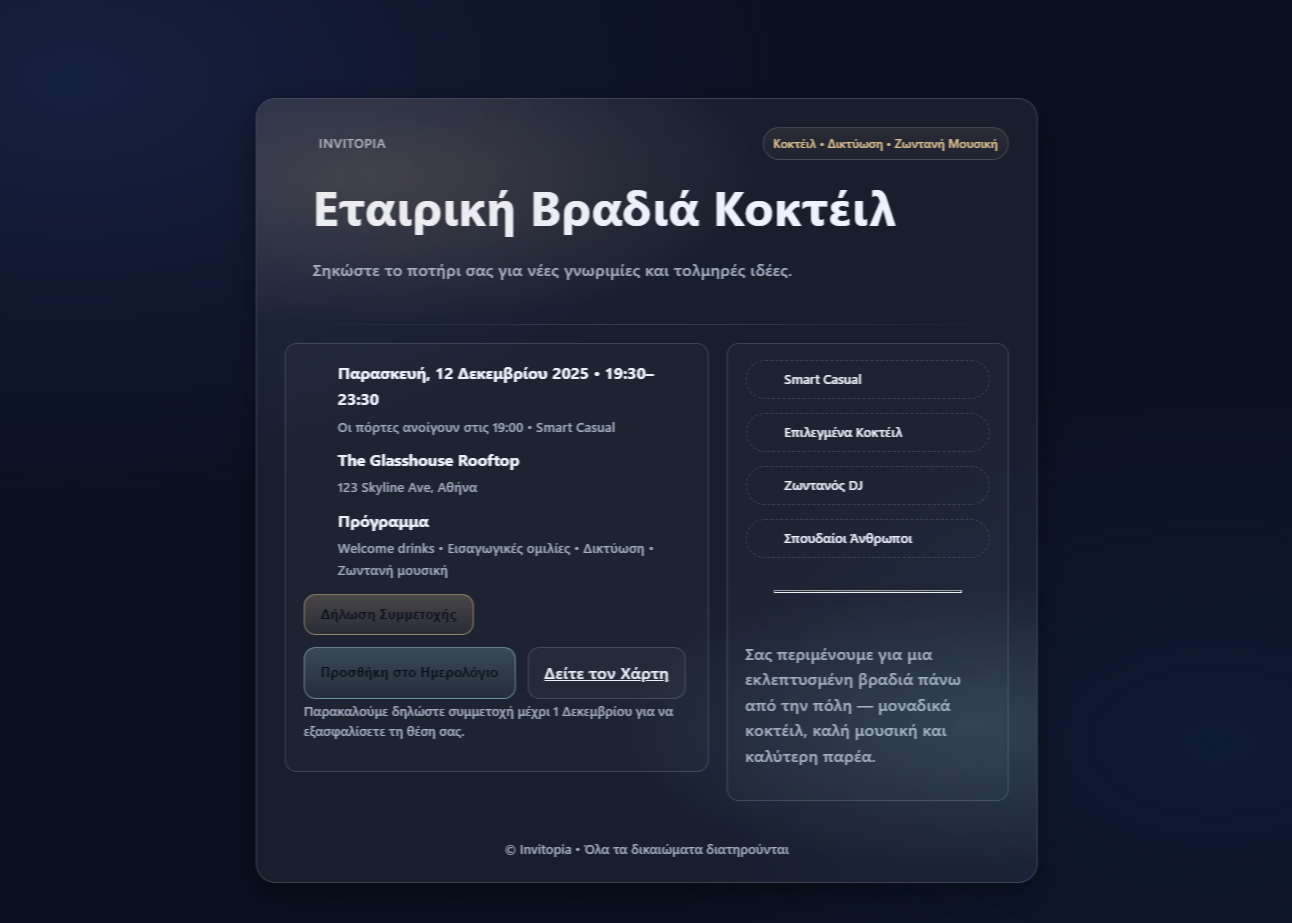 “Με το Invitopia οργανώσαμε τα γενέθλια του πατέρα μας. Από το RSVP μέχρι τις αναμνηστικές φωτογραφίες, όλοι έμειναν με το χαμόγελο.”